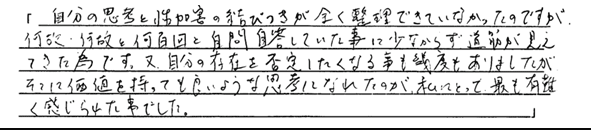 自分の思考と性加害の結びつきが全く理解できていなかったのですが、何故・何故と何百回と自問自答していた事に少なからず道筋が見えて来た為です。また自分の存在を否定したくなることも幾度もありましたが、そこに価値を持っても良いような思考になれたのが、私にとって最も有り難く感じられる事でした