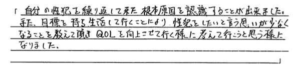 自分の性犯を繰り返して来た根本原因を認識することが出来ました。また、目標を持ち生活をしていくことにより、性犯をしたいという思いが少なくなることを教えて頂き、QOLを向上させて行くように考えて行こうと思うようになりました