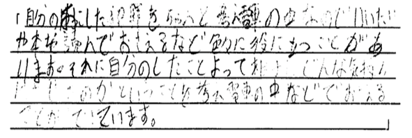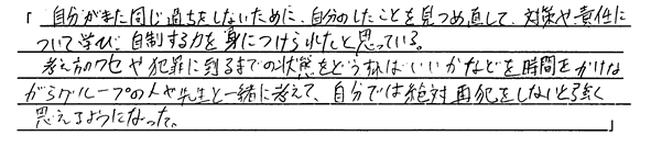 自分がまた同じ過ちをしないために、自分のしたことを見つめ直して、対策や責任について学び、自制する力を身につけられたと思っている。考え方のクセや犯罪に至るまでの状態をどうすればいいかなどを時間をかけながらグループの人や先生と一緒に考えて、自分では絶対再犯をしないと強く思えるようになった。