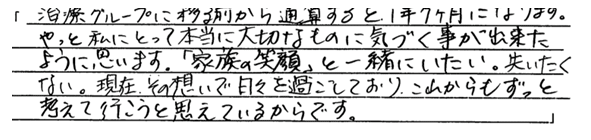 治療グループに移る前から通算すると1年7ヶ月になります。やっと私にとって本当に大切なものに気付くことができたように思います。「家族の笑顔」と一緒にいたい。失いたくない。現在、その想いで日々を過ごしており、これからもずっと考えていこうと思えているからです。
