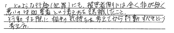 どのような行為(犯罪)にも、被害者側には全く非がなく、悪いのは加害者という考え方を認識したこと。行動する際に、相手の気持ちを考えてから行動すべきという考え方。