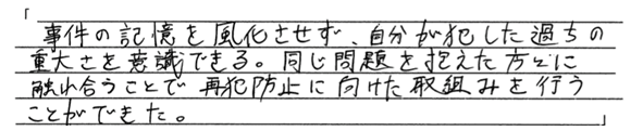 事件の記憶を風化させず、自分が犯した過ちの重大さを意識できる。同じ問題を抱えた方々に触れ合うことで、再犯防止に向けた取り組みを行うことができた