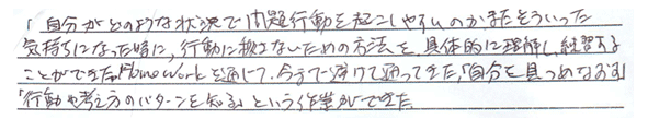 自分がどのような状態で問題行動を起しやすいのか、またそういった気持ちになった時に行動に移さない為の方法を具体的に理解し、練習することができた。Home Workを通じて、今まで避けて通って来た「自分と見つめなおす」「行動や考え方のパターンを知る」という作業ができた。