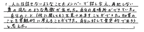 人には話せないようなこともメンバーで話し合え、再犯しない為の同志のような意識が高かった。自分の居場所ができていた。自分のこと(性に関しても)を見つめ直すことができた。加害のことを客観的に考えることができた。自分に対して肯定的であろうと思えた。