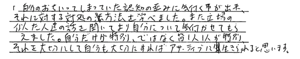 自分のおちいってしまっていた認知の歪みに気付く事が出来、それに対する対処の方法を学べました。また立場の似た人達の話を聞いてより自分について気付かせてもらえました。自分だけが特別ではなく、皆1人1人が特別、それを大切にして自分も大切にすればアサーティブに生きられると思います。