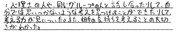 心理士の人や同じグループの人と話し合ったりして、自分では思いつかないような考えを見つけることができたりして、考える力が身についた。相手の気持ちを考えることの大切さがわかった
