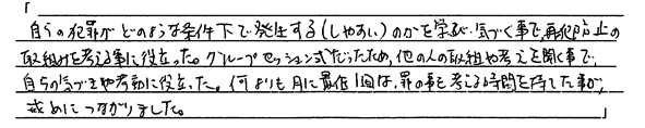 自らの犯罪がどのような条件下で発生する(しやすい)のかを学び、気付くことで、再犯防止の取り組みを考えることに役立った。グループセッション式だったため、他の人の取り組みや考えを聞くことで自らの気付きや考え方に役立った。何よりも月に最低1回は、罪のことを考える時間を持てたことが戒めにつながりました。