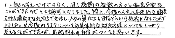 自分の考えだけでなく、同じ境遇の複数の方々と意見交換することができたのでとても参考になりました。特に、今後の人生に具体的な目標を持ち、前向きな気持ちで生活し、人生の質の向上を目指そうという気持ちになることできました。また、今後のリスクについての具体的な対処法についてもしっかり考えることができたので、再犯防止の自信がついたと思います。