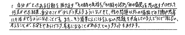 自分がとったある行動を振り返り「その時の気持ち」「その時の認知」「体の感覚」を思い出すプロセスを何度かやった結果、自分のことが少しずつ見えるようになってきて、性の問題以外の場面での行動や思考にも活かせるようになった。また、そう簡単に人には言えない問題を共有している人同士で話し合い、考えることが不安を和らげたり、参考になることがあったりしました。