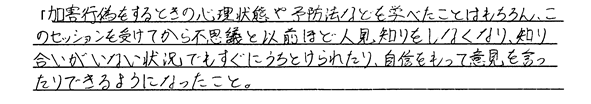 加害行為をするときの心理状態や予防法などを学べた事はもちろん、このセッションを受けてから不思議と以前ほど人見知りをしなくなり、知り合いがいない状況でもすぐにうちとけられたり、自信を持って意見を言ったりできるようになった。